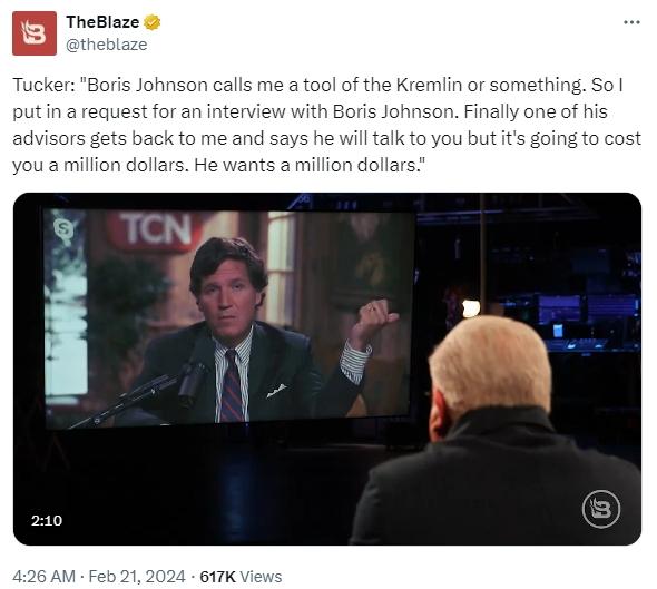 中新網(wǎng)2月21日電 綜合外媒消息,近日,美國記者卡爾森在接受美國新聞網(wǎng)站“TheBlaze”的采訪時(shí)透露,他此前曾試圖采訪英國前首相約翰遜,但約翰遜要卡爾森支付100萬美元才同意接受采訪。