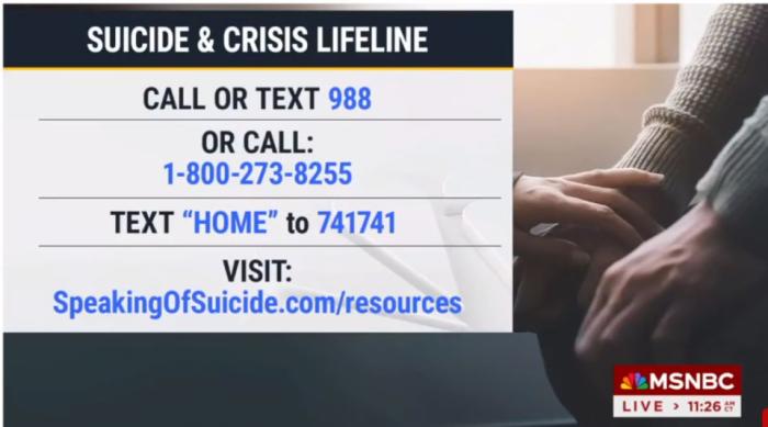 前面還挺正常,就是對(duì)事件的報(bào)道,畫(huà)面也在播報(bào)員和現(xiàn)場(chǎng)鏡頭之前互相切(順帶一提MSNBC的說(shuō)辭也是“抗議哈以戰(zhàn)爭(zhēng)”),然后話鋒突然一轉(zhuǎn):“如果你發(fā)現(xiàn)有人有心理健康風(fēng)險(xiǎn),請(qǐng)及時(shí)撥打預(yù)防自殺熱線XXXXX……”