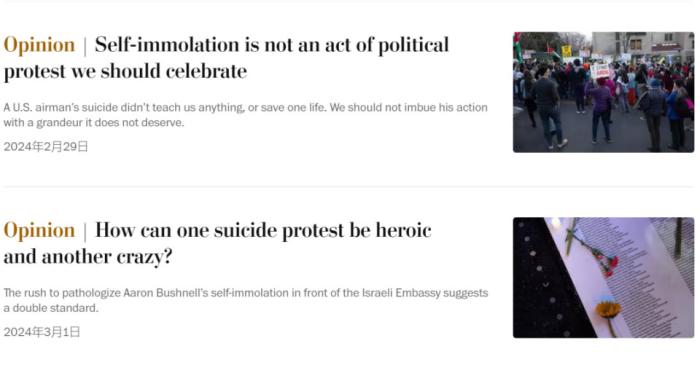 實(shí)際上,因?yàn)椴际矁?nèi)爾在直播中的話有非常多的政治標(biāo)簽,標(biāo)題想要體現(xiàn)自焚事件的原因本來(lái)是非常容易的。但在西方主流媒體的報(bào)道標(biāo)題中,最能直觀表明布什內(nèi)爾行為原因的三個(gè)關(guān)鍵詞——“加沙”(Gaza)“種族滅絕”(genocide)乃至“抗議”(protest)字樣均未出現(xiàn)。
