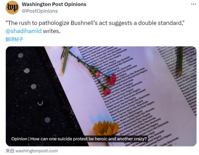 后一篇中提及了很多中文媒體中提到的對(duì)布什內(nèi)爾和“阿拉伯之春”自焚事件的“雙標(biāo)”問(wèn)題,看起來(lái)是為布什內(nèi)爾說(shuō)話了。好了,看起來(lái)郵報(bào)這是公平公正,讓正反方辯手都上場(chǎng)辯論,各顯其能。