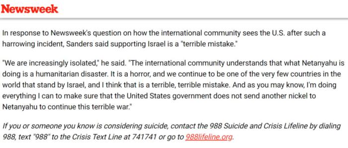 另一家媒體《新聞周刊》,現(xiàn)在則會(huì)在每一篇有關(guān)布什內(nèi)爾的文章文末附上預(yù)防自殺熱線的信息。比如下面這篇文章只是關(guān)于美國(guó)左翼議員伯尼·桑德斯對(duì)布什內(nèi)爾事件的評(píng)論,內(nèi)容跟布什內(nèi)爾本人其實(shí)無(wú)甚關(guān)系,也要附上這么一段……