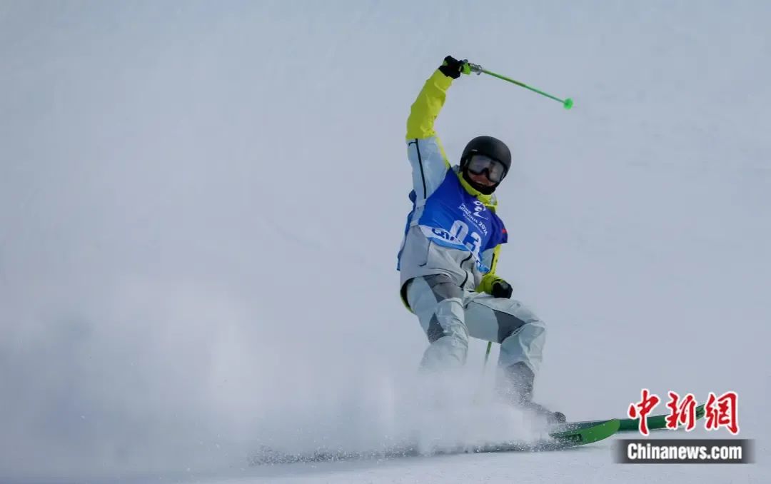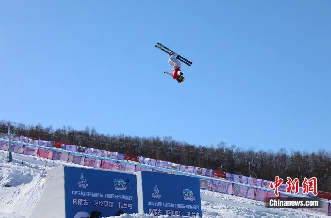 “十四冬 ”自由式滑雪空中技巧公開組女子個人比賽中,徐夢桃在空中翻飛。 韓冷 攝
