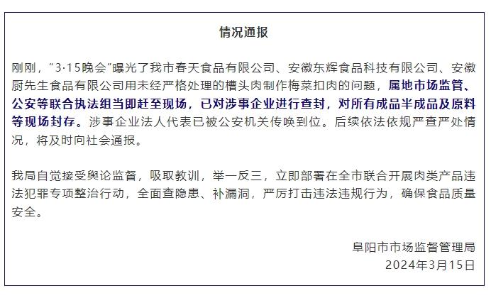 涉事企業(yè)所在的阜陽市市場監(jiān)督管理局當(dāng)晚發(fā)布情況通報(bào)稱,屬地市場監(jiān)管、公安等聯(lián)合執(zhí)法組當(dāng)即趕至現(xiàn)場,已對涉事企業(yè)進(jìn)行查封,對所有成品半成品及原料等現(xiàn)場封存。涉事企業(yè)法人代表已被公安機(jī)關(guān)傳喚到位。后續(xù)依法依規(guī)嚴(yán)查嚴(yán)處情況,將及時(shí)向社會通報(bào)。