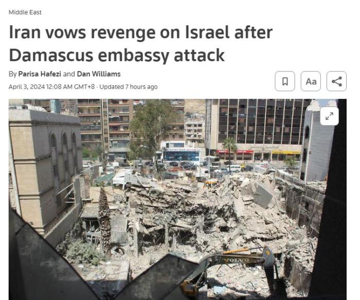 據(jù)此前報(bào)道,伊朗伊斯蘭革命衛(wèi)隊(duì)當(dāng)?shù)貢r(shí)間1日表示,伊朗駐敘利亞大使館領(lǐng)事部門建筑遭以色列襲擊,造成包括高級將領(lǐng)在內(nèi)的多名成員死亡。