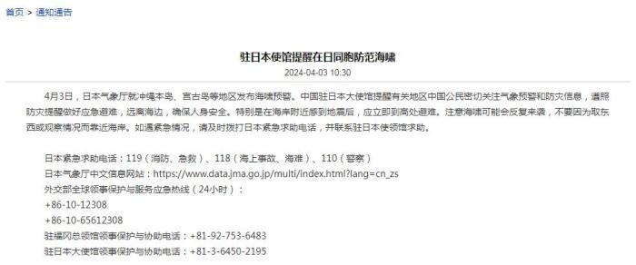 中新網(wǎng)4月3日電 據(jù)中國(guó)駐日本大使館官網(wǎng)消息,4月3日,日本氣象廳就沖繩本島、宮古島等地區(qū)發(fā)布海嘯預(yù)警。中國(guó)駐日本大使館提醒有關(guān)地區(qū)中國(guó)公民密切關(guān)注氣象預(yù)警和防災(zāi)信息,遵照防災(zāi)提醒做好應(yīng)急避難,遠(yuǎn)離海邊,確保人身安全。特別是在海岸附近感到地震后,應(yīng)立即到高處避難。注意海嘯可能會(huì)反復(fù)來(lái)襲,不要因?yàn)槿|西或觀察情況而靠近海岸。如遇緊急情況,請(qǐng)及時(shí)撥打日本緊急求助電話,并聯(lián)系駐日本使領(lǐng)館求助。