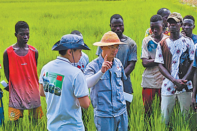 中國農(nóng)業(yè)專家為科特迪瓦農(nóng)民進行水稻病蟲防治的培訓。