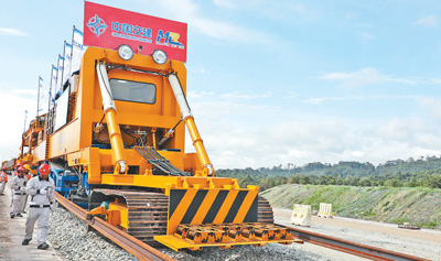 在馬來西亞彭亨州關(guān)丹市馬東鐵項(xiàng)目現(xiàn)場,鋪軌機(jī)正在作業(yè)。