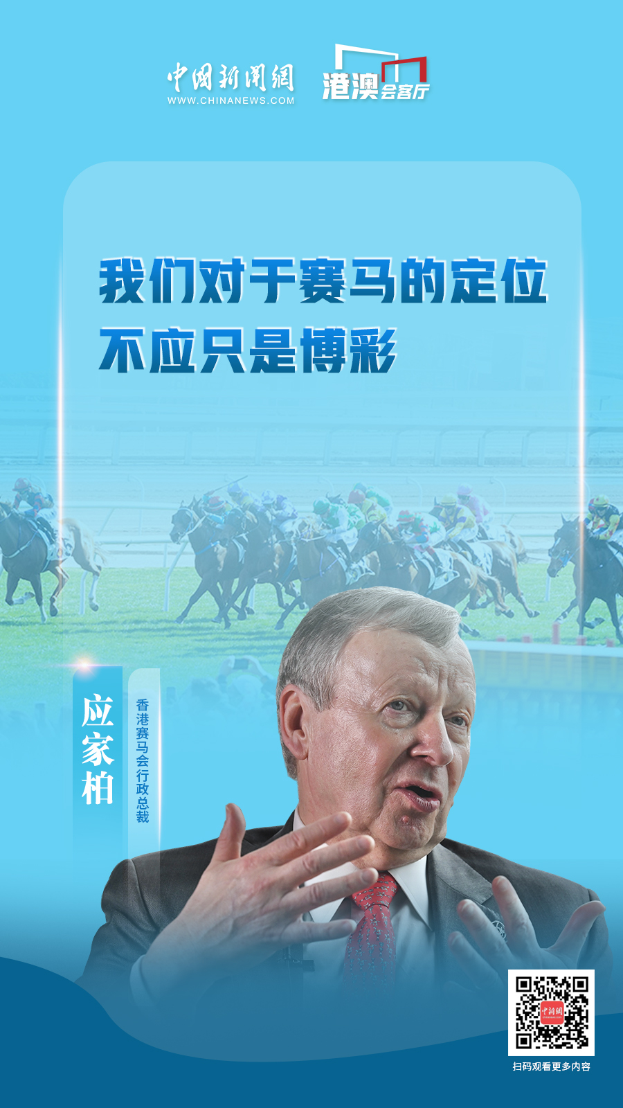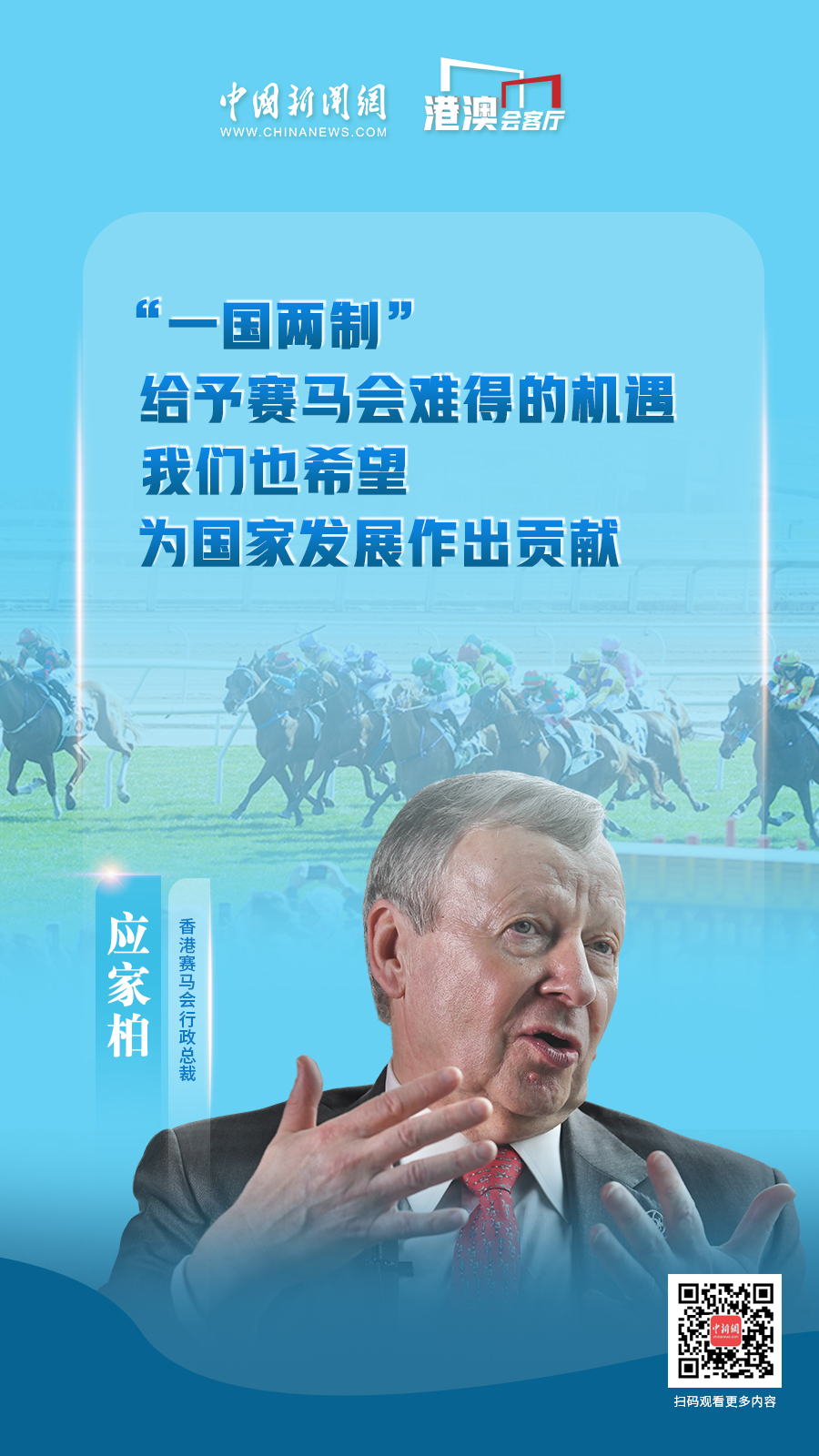 這是應(yīng)家柏出任香港賽馬會行政總裁的第17年,亦是《粵港澳大灣區(qū)發(fā)展規(guī)劃綱要》發(fā)布五周年,他帶領(lǐng)賽馬會緊握機遇,從“一國兩制”優(yōu)勢,到粵港澳大灣區(qū)帶來的發(fā)展空間,繼續(xù)全方位地豐富著香港的賽馬精神。他如何看待香港賽馬事業(yè)發(fā)展現(xiàn)狀和瓶頸?未來拓展的方向又在何處?應(yīng)家柏近日接受中國新聞網(wǎng)“港澳會客廳”專訪,對這些問題一一作出解答。