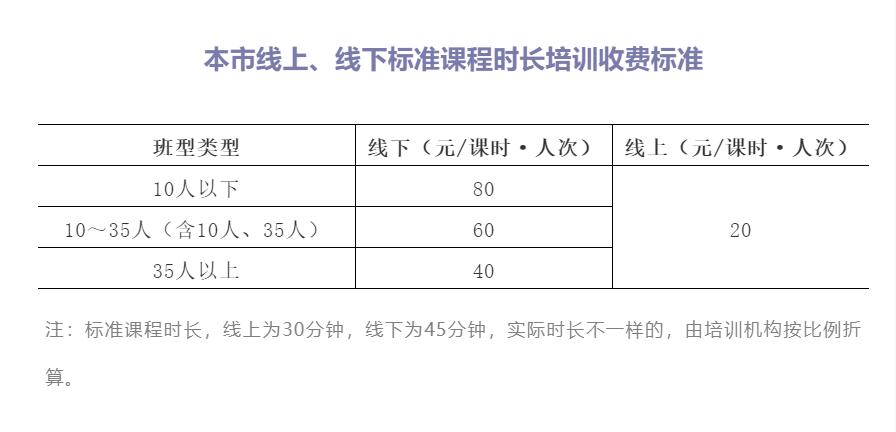 按照國(guó)家“要區(qū)分線上和線下以及不同班型,分類制定標(biāo)準(zhǔn)課程時(shí)長(zhǎng)的基準(zhǔn)收費(fèi)標(biāo)準(zhǔn)”的要求,根據(jù)國(guó)家規(guī)定的主要定價(jià)班型,確定了本市線上、線下學(xué)科類校外培訓(xùn)的基準(zhǔn)收費(fèi)標(biāo)準(zhǔn)和浮動(dòng)幅度。