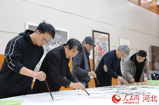 活動(dòng)現(xiàn)場,藝術(shù)家們分三組分別創(chuàng)作了兩幅山水畫《銀龍飛馳逐夢冬奧》《太行雪霽》和一幅花鳥畫《萬象和合》。同時(shí),來自北京、天津、河北、四川等省內(nèi)外畫家的冬奧題材美術(shù)作品也在現(xiàn)場展出。