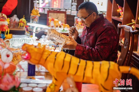 1月24日,南京秦淮花燈傳承藝人曹真榮正在趕制以“虎”為主題的花燈。隨著農(nóng)歷虎年春節(jié)的臨近,南京老城南一帶的民間花燈藝人加班加點(diǎn)趕扎花燈,迎接春節(jié)的到來(lái)。 中新社記者 泱波 攝