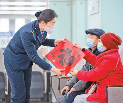 春運(yùn)期間,南京火車站從細(xì)節(jié)著手、小事出發(fā),推出了一系列溫馨服務(wù)?!?58”雷鋒服務(wù)站購置一批適合兒童使用的口罩,教孩子們?nèi)绾握_佩戴,同時(shí)為乘車旅客送上春聯(lián)、窗花或“福”字。圖為“158”雷鋒服務(wù)站客運(yùn)值班員為旅客送上新春祝福。