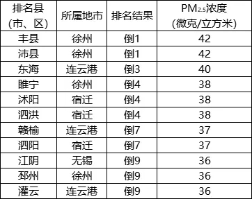 PM2.5濃度改善幅度相對較好的前10位(1-10名)依次是:沛縣、洪澤(江都并列)、射陽、漣水、灌南、儀征、睢寧(沭陽并列)、通州(鹽都并列)。