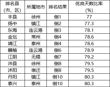 優(yōu)良天數(shù)比率相對較差的后10位(倒1-10名)依次是:豐縣、揚中、東海、金壇(靖江并列)、贛榆、江陰、沛縣(沭陽并列)、丹陽(泰興并列)。