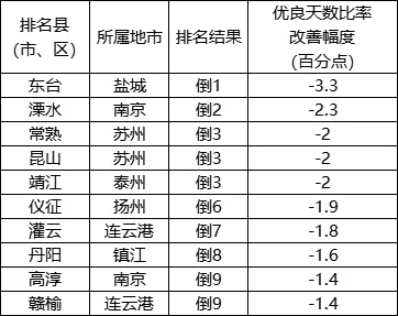 優(yōu)良天數(shù)比率改善幅度相對較差的后10位(倒1-10名)依次是:東臺、溧水、常熟(昆山、靖江并列)、儀征、灌云、丹陽、高淳(贛榆并列)