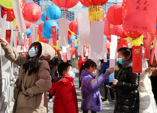 在百年建筑九如樓前的花燈廣場,200件掛有傳統(tǒng)燈謎的彩色宣紙燈籠與北京雪后藍天相映成趣,全天開放燈謎游戲供民眾互動參與。