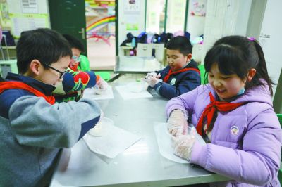 昨天,小學(xué)生在鼓樓區(qū)南財(cái)大附小參加小廚神社團(tuán)活動(dòng)。 南京日?qǐng)?bào)/紫金山新聞?dòng)浾?徐琦 攝