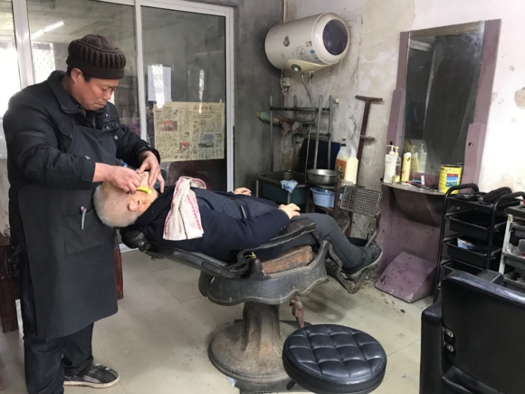 “推好了,來,再洗下,然后刮刮胡子?!?對(duì)話間,沈建平引導(dǎo)嚴(yán)老師到水池旁,用熱水沖洗了頭,然后請(qǐng)嚴(yán)老師躺到了另一張“古董”椅子上,繼續(xù)麻利地修面和刮胡子。