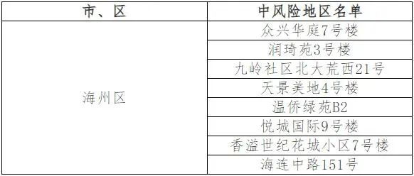 通告稱,根據(jù)國務(wù)院聯(lián)防聯(lián)控機(jī)制有關(guān)規(guī)定,經(jīng)綜合評估研判,市指揮部決定,自2022年3月6日0時(shí)起,將眾興華庭7號樓、潤琦苑3號樓、九嶺社區(qū)北大荒西21號、天景美地4號樓、溫僑綠苑B2、悅城國際9號樓、香溢世紀(jì)花城小區(qū)7號樓、海連中路151號調(diào)整為中風(fēng)險(xiǎn)地區(qū),其他地區(qū)風(fēng)險(xiǎn)等級不變。