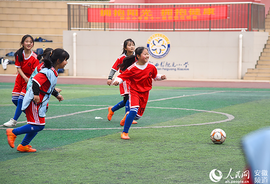 “小足球女將”們?cè)谇驁?chǎng)上快樂奔跑。人民網(wǎng) 李希蒙攝
