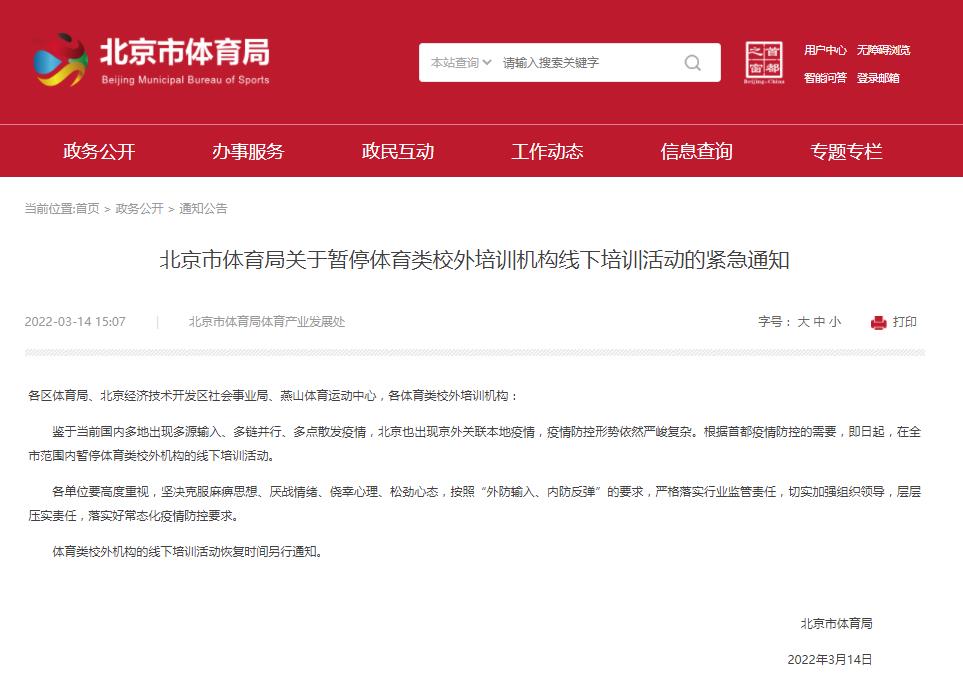 北京:全市范圍內(nèi)暫停體育類校外機構(gòu)的線下培訓活動