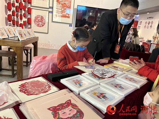 走進展廳,樂亭皮影戲的表演贏得了場下陣陣掌聲,感興趣的小朋友在后臺體驗皮影戲。蔚縣剪紙、武強木版年畫、樂亭皮影戲雕刻展臺前圍著許多大人與小孩,他們積極參與,觸摸、體驗,聽非遺傳承人介紹背后的故事。