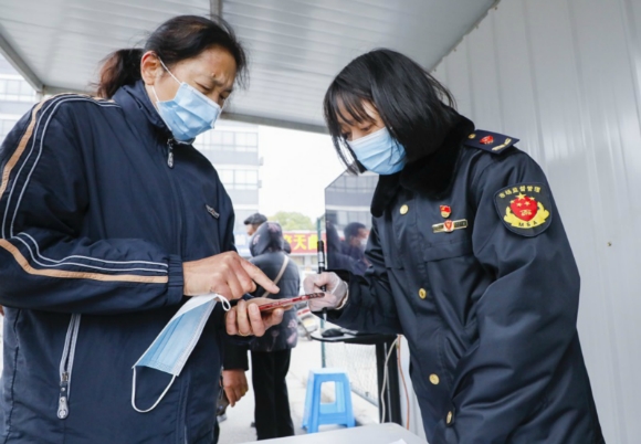 志愿者在卡點(diǎn)指導(dǎo)進(jìn)出人員打開(kāi)健康碼,填報(bào)個(gè)人信息和出行方式、來(lái)源地、目的地等必要信息。張莉琳攝