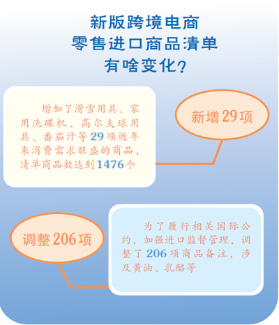 此次調(diào)整,在《跨境電子商務(wù)零售進(jìn)口商品清單(2019年版)》基礎(chǔ)上,增加了滑雪用具、家用洗碟機(jī)、高爾夫球用具、番茄汁等29項近年來消費(fèi)需求旺盛的商品,涉及食品、家用電器、運(yùn)動用品等多類別,清單商品數(shù)達(dá)到1476個。