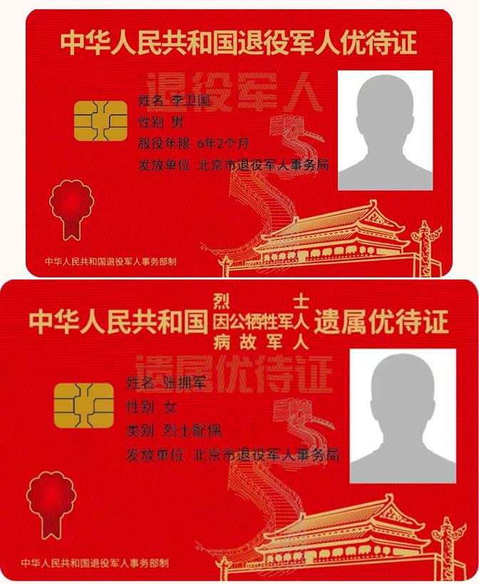 據(jù)介紹,優(yōu)待證以紅色為基調(diào),正面印有優(yōu)待證種類名稱,持證人基本信息、相片等。背面印有制證銀行名稱、銀行卡號(hào)等信息。優(yōu)待證分為“中華人民共和國(guó)退役軍人優(yōu)待證”“中華人民共和國(guó)烈士、因公犧牲軍人、病故軍人遺屬優(yōu)待證”兩種,分別面向符合條件的退役軍人和烈士遺屬、因公犧牲軍人遺屬、病故軍人遺屬等其他優(yōu)撫對(duì)象免費(fèi)發(fā)放,是持證人彰顯榮譽(yù)的載體、享受優(yōu)待的憑證。