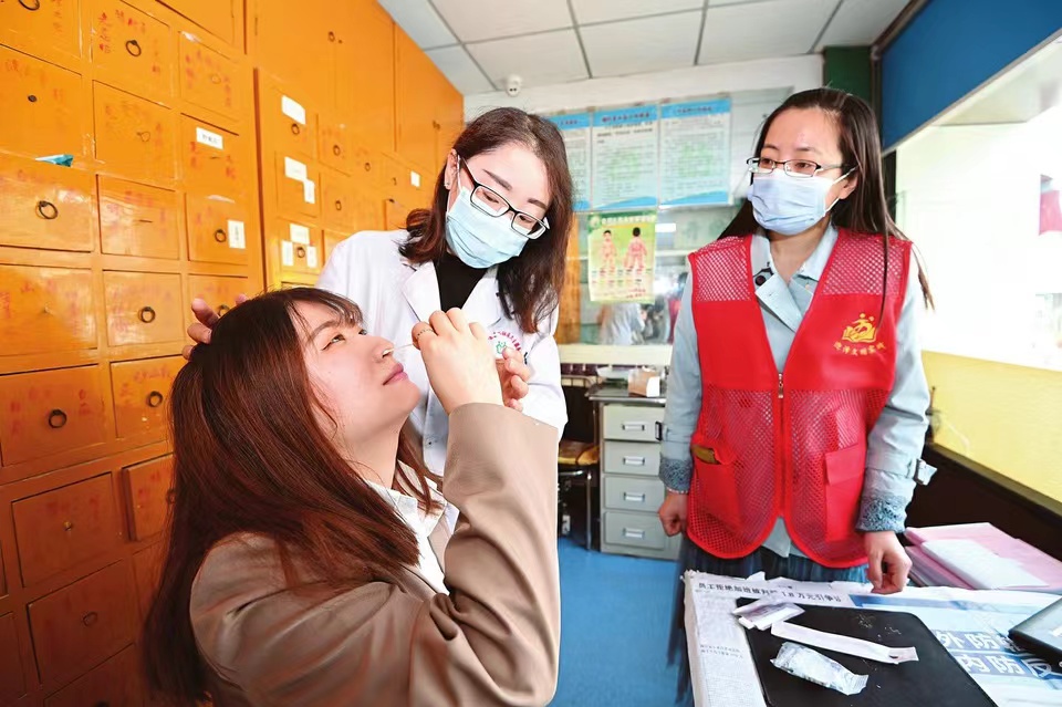 4月6日,太原市迎澤區(qū)老軍營社區(qū)衛(wèi)生服務(wù)站內(nèi),老軍營二社區(qū)工作人員和衛(wèi)生服務(wù)站的醫(yī)護(hù)人員在學(xué)習(xí)使用新冠抗原檢測試劑,掌握使用方法和檢測結(jié)果確認(rèn)方式。當(dāng)日,老軍營二社區(qū)與社區(qū)衛(wèi)生服務(wù)站聯(lián)合引入新冠抗原檢測試劑,組織工作人員學(xué)習(xí)使用,以便試劑下發(fā)居民之后快速教授居民使用方法。(記者阮洋攝)