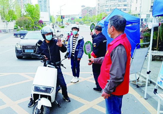 4月5日,在金華婺城區(qū)城東街道通園路社區(qū)各暖心服務點、小區(qū)出入口,管理人員落實測溫、亮碼、戴口罩的要求,“場所碼”逢進必掃,社區(qū)自行設計了便攜式“掃碼桿”。使用“掃碼桿”后,過往車輛和行人掃碼的效率明顯提高,縮短了通過時間,拉開了志愿者和來往車輛及人員的距離,避免人員接觸。(時寬兵)