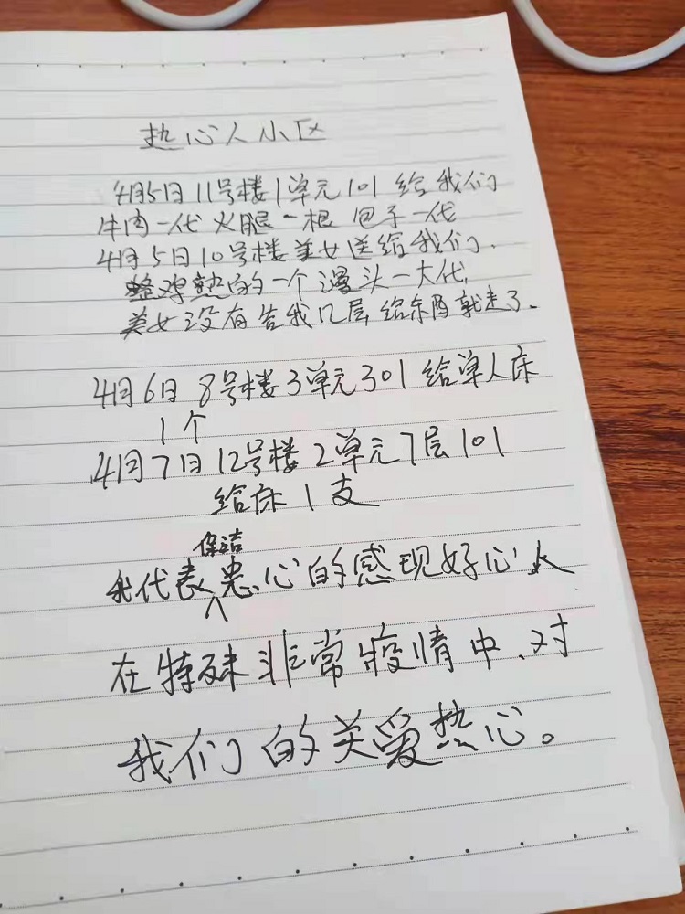 “4月5日,11號(hào)樓1單元101,給我們牛肉一袋,火腿一根,包子一袋;4月5日,10號(hào)樓送來(lái)整雞一個(gè),饅頭一大袋,但是沒(méi)有留下具體門(mén)牌就走了;4月6日,8號(hào)樓3單元301給單人床一個(gè);4月7日,12號(hào)樓2單元7層101給床一個(gè)。我代表保潔衷心地感謝好心人,在非常時(shí)期,對(duì)我們的關(guān)愛(ài)。”
