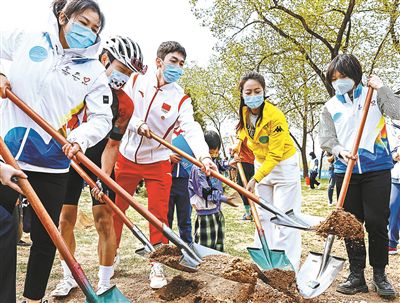 此次活動由國家體育總局冬運(yùn)中心與北京市石景山區(qū)共同舉辦,是“冰雪向未來”全國群眾性冰雪主題活動的第一站,也是北京冬奧會后冰雪項目國家隊公益服務(wù)計劃的首場活動。圖為昨日,北京冬奧會冠軍武大靖(左三)在北京冬奧公園內(nèi)的“中國冰雪冠軍林”植樹。