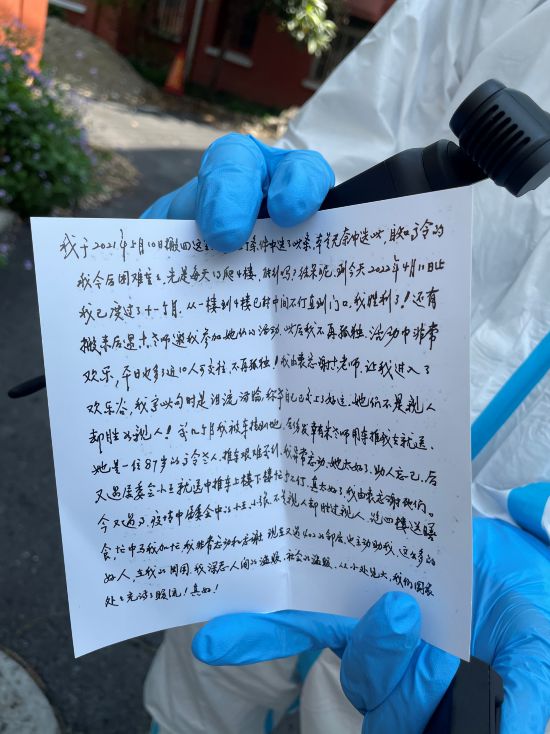 幾經(jīng)推辭,錢留在老人家手里,但她還執(zhí)拗地遞來兩封信,一封短的,本來包鈔票用的:這是給您們和廣大志愿者添些營(yíng)養(yǎng)品用,望勿拒。還有封長(zhǎng)信里提到,“疫情中,居委會(huì)的小王、小張,不是親人卻勝過親人,跑四樓送膳食,我非常感謝。”