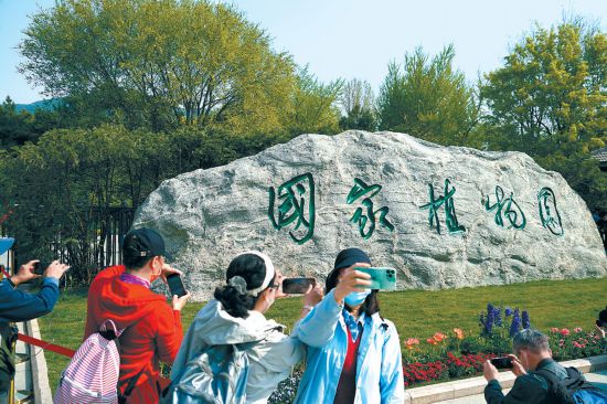 圖:昨天,國(guó)家植物園正式在北京揭牌,吸引眾多游客拍照留影。 本報(bào)記者 程功攝