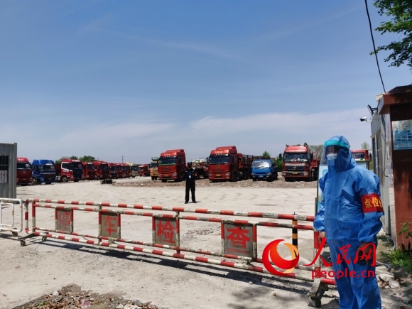 工作人員對(duì)外來貨車及駕乘人員進(jìn)行信息登記。人民網(wǎng)記者 王繼亮攝