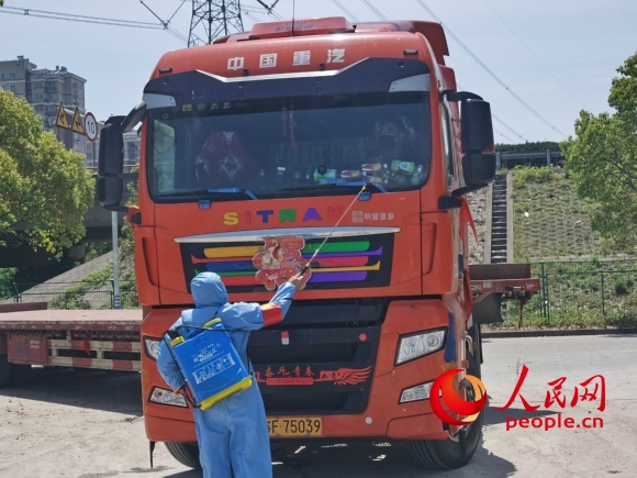 疫情防控人員對(duì)外來貨車進(jìn)行消殺。人民網(wǎng)記者 王繼亮攝