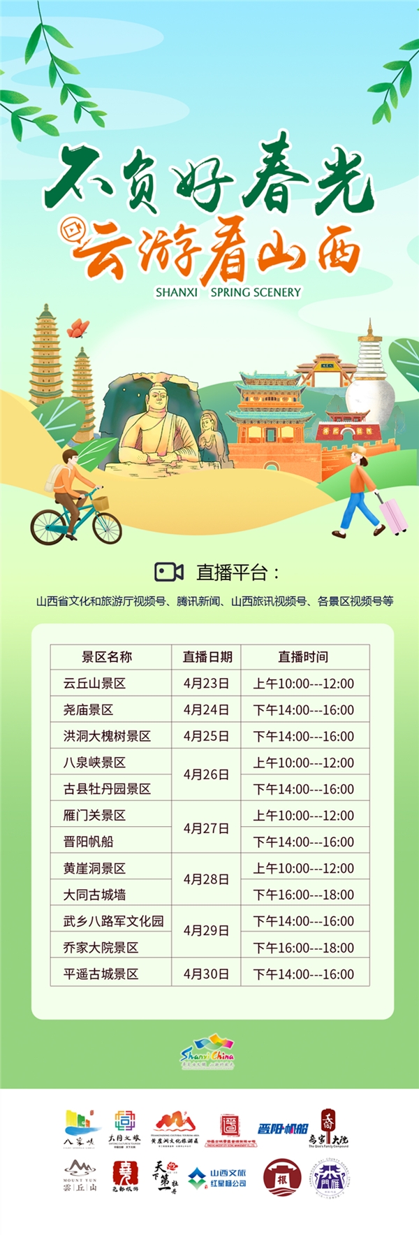 值得一提的是,2022年中國旅游日主會場落地山西晉中平遙古城舉辦,將大大激發(fā)山西省文旅市場的活力,本次系列直播活動將成為各個景區(qū)主動宣傳亮相的有力平臺。屆時,山西省文化和旅游廳、各地市文旅局、主流新聞媒體及自媒體賬號等將進(jìn)行多平臺的聯(lián)合推廣,共同打造山西“五一”旅游新熱潮,與全國網(wǎng)友一起“不負(fù)好春光·云游看山西”!