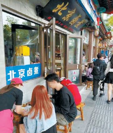以什剎海游覽區(qū)東北角為例,沿街的小吃窗口相對密集,這些窗口附近正好是長長的臺階。從下午到傍晚,游客們像走進(jìn)了階梯教室一樣,人擠人、人挨人地坐到了臺階上,烤串、爆肚、熟食席地擺放,用餐人員的密集程度比堂食還要高。