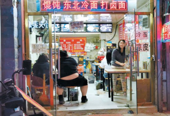 一路向西,類似的現(xiàn)象更是頻頻出現(xiàn),個別商家仍在做著“路邊攤”的生意。一名商戶告訴記者,因為點餐需要排隊,所以在便道上設(shè)置了等候區(qū),掃碼點餐時商戶已和顧客講明,只能點選打包帶走。記者眼見那些餐食果真裝進(jìn)打包餐盒,送到了所謂的等候區(qū),可是顧客拿到手并未離開,打開餐盒立刻大快朵頤,顯然等候區(qū)只是給堂食外擺打了個掩護(hù)。