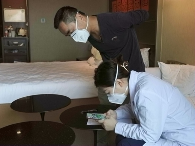 5月4日晚6點多,從香港求醫(yī)歸來的張氏夫婦懷抱著精神萎靡的哼哼,由機場大巴閉環(huán)轉運至海淀區(qū)紅杉集中醫(yī)學隔離觀察點,晚上8點半,到達酒店辦理入住。來自四季青醫(yī)院的張龍珍負責接待工作,豐富的工作經(jīng)驗讓她第一時間注意到了被母親抱在懷中的哼哼,臉有一些不正常的浮腫,便上前詢問情況,得知他患有神經(jīng)母細胞瘤并轉移至腦部及全身時,張龍珍便親自照顧起了這一家人,一步一步指導哼哼爸爸掃碼,填寫個人信息,并在前臺開放綠色通道,快速為他們辦理入住。