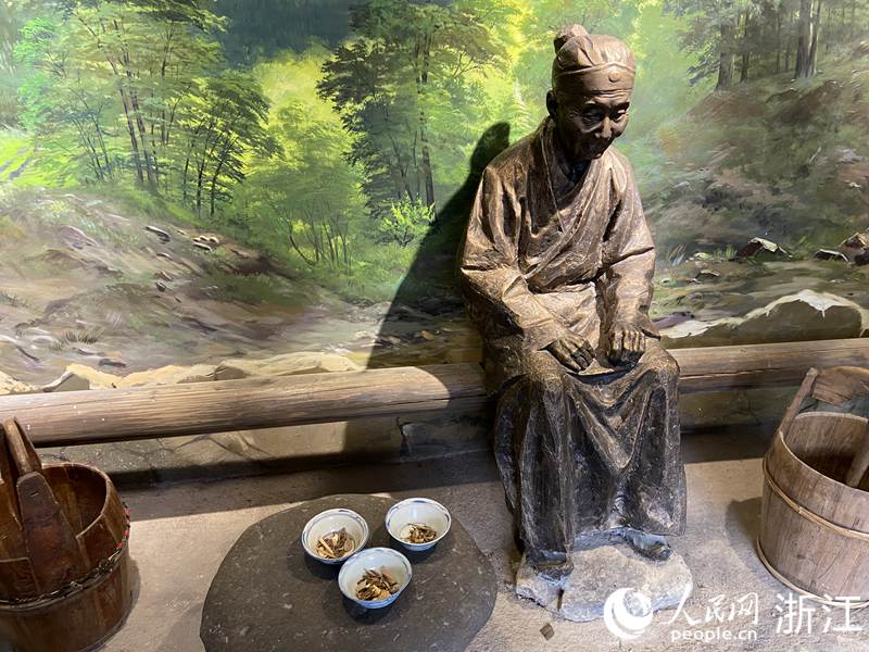 中國(guó)自古有施茶傳統(tǒng),鄉(xiāng)間有三里立茶亭、十里建長(zhǎng)亭施茶,供路人休憩的風(fēng)俗。在茶之俗展廳,記者看到了一比一還原的施茶場(chǎng)景:施茶者坐于亭內(nèi),面前是3碗裝有端午茶的茶碗,等待過(guò)往路人前來(lái)飲用。施茶的習(xí)俗也體現(xiàn)了松陽(yáng)人樂(lè)善好施的傳統(tǒng)美德。