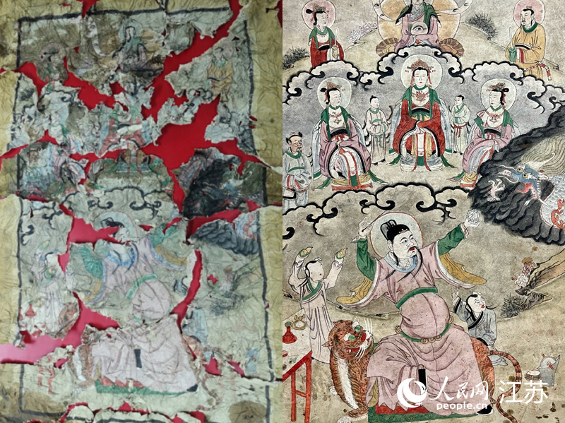 “一開始是想請我們鑒定這些紙張的成分,誰都沒想到里面有一幅畫。”在這些外表堅硬,覆有泥沙的紙漿團中,陳思燚和團隊發(fā)現(xiàn)紙團內部大有乾坤。經過商討,他們決定使用蒸揭法,對紙團進行展揭。展開后的紙團,畫心內容總共有188片,拼合完整后,為一幅顏色艷麗、內容完整的人物工筆重彩畫。