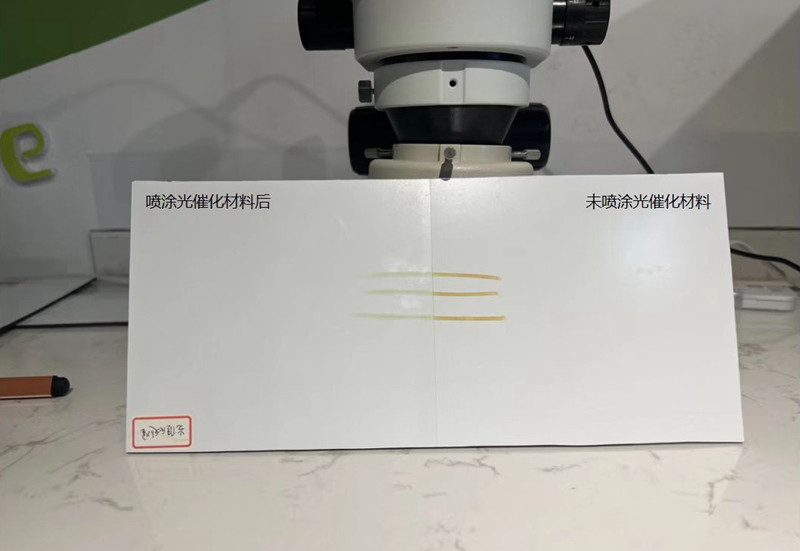 “將一塊鋁面板一分為二,一塊噴涂光催化涂膜,另一塊不噴涂。用有機(jī)染料筆模仿外界污染物,在兩塊材料表面標(biāo)記后,通過一分鐘紫外光燈照射,可看出噴涂了光催化涂膜的瓷磚鋁板部分染料降解效果明顯更高?!惫ぷ魅藛T告訴人民網(wǎng)浙江頻道,根據(jù)國家權(quán)威檢測機(jī)構(gòu)的實(shí)驗(yàn)證明,每噴涂1立方米的光催化涂膜,就能清除95%的甲醛。