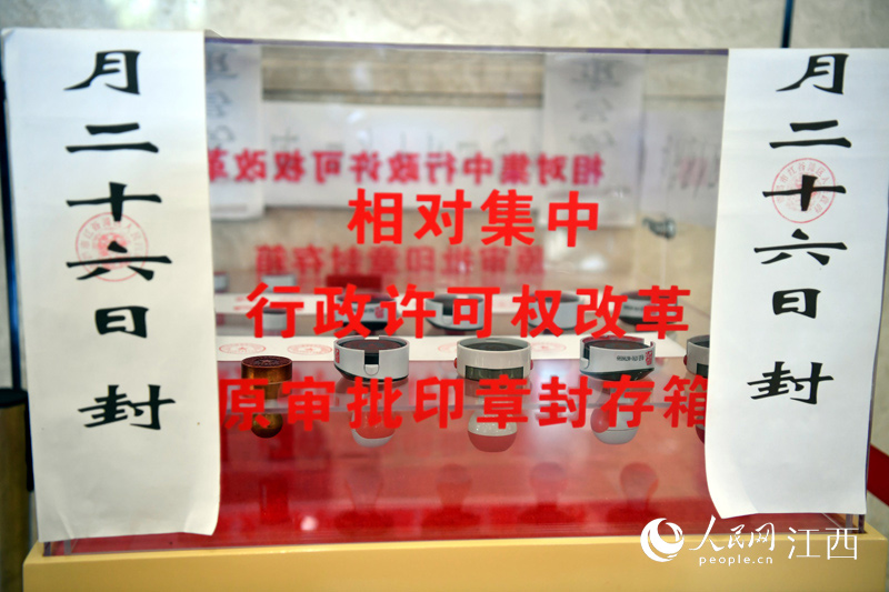 南昌紅谷灘區(qū)設(shè)立“難事直通車”專窗,優(yōu)化營商環(huán)境。圖為紅谷灘區(qū)行政審批局內(nèi)展示封存的原審批印章。人民網(wǎng) 時雨攝