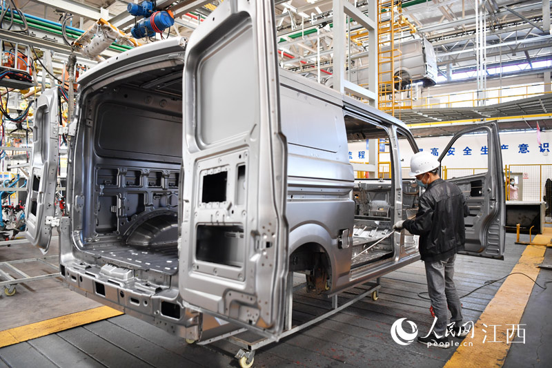 在江西省贛州市經(jīng)開區(qū)的一家汽車生產(chǎn)企業(yè)的車間里,工人們正在作業(yè)。人民網(wǎng) 時雨攝