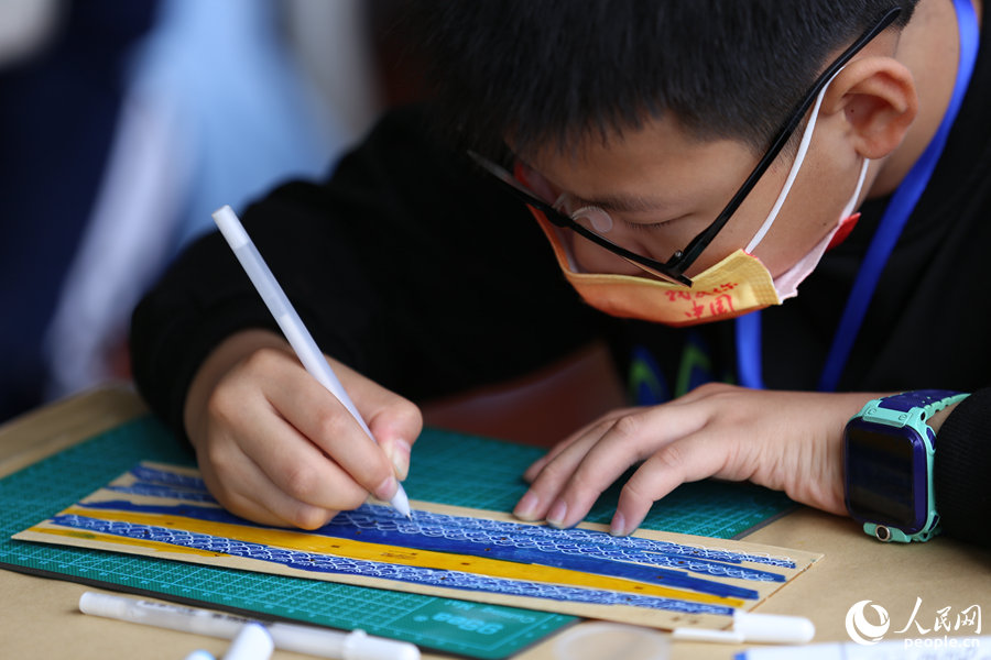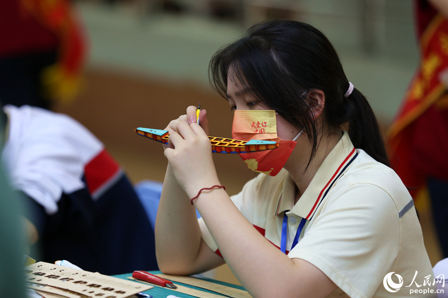 活動現(xiàn)場,選手們列隊進(jìn)入各自賽場,用畫筆在龍舟模型素材板上畫出各式圖案,再將一個個零部件手工拼接,組裝成一條條獨具特色的“小龍舟”,船體或是金銀鱗甲,或是祥云波浪,色彩斑斕,風(fēng)格不一。