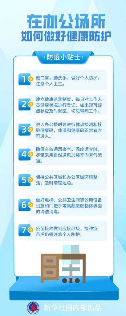 當(dāng)前,全國(guó)日新增本土確診病例和無(wú)癥狀感染者數(shù)量繼續(xù)下降,但每日仍有10余個(gè)省份報(bào)告新增本土感染者,疫情防控形勢(shì)依然嚴(yán)峻復(fù)雜。國(guó)家衛(wèi)生健康委疾控局副局長(zhǎng)、一級(jí)巡視員雷正龍?zhí)崾?,要落?shí)重點(diǎn)場(chǎng)所、重點(diǎn)人群、重點(diǎn)單位防控措施。在辦公場(chǎng)所如何做好健康防護(hù)?這份來(lái)自國(guó)家衛(wèi)生健康委的防護(hù)指南請(qǐng)收好。(宋晨、李恒)