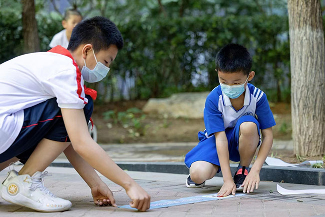 陶然亭街道大吉巷社區(qū)的一處核酸點位上,兩米線安全提示標識引起大伙兒注意?!氨苊饩奂?,嚴防疫情”“綠色出行,愛心助考”“文明陪考,安全第一”……誰能想到這些醒目的標語竟然是“陶然娃”們想的“愛心助考公約”?!榜R上就是高考了,希望哥哥姐姐們能取得好成績,不辜負自己多年的努力?!?3歲的陳博一趴在地上,奮力的拍了拍自己剛剛貼好的“公約宣傳條”。
