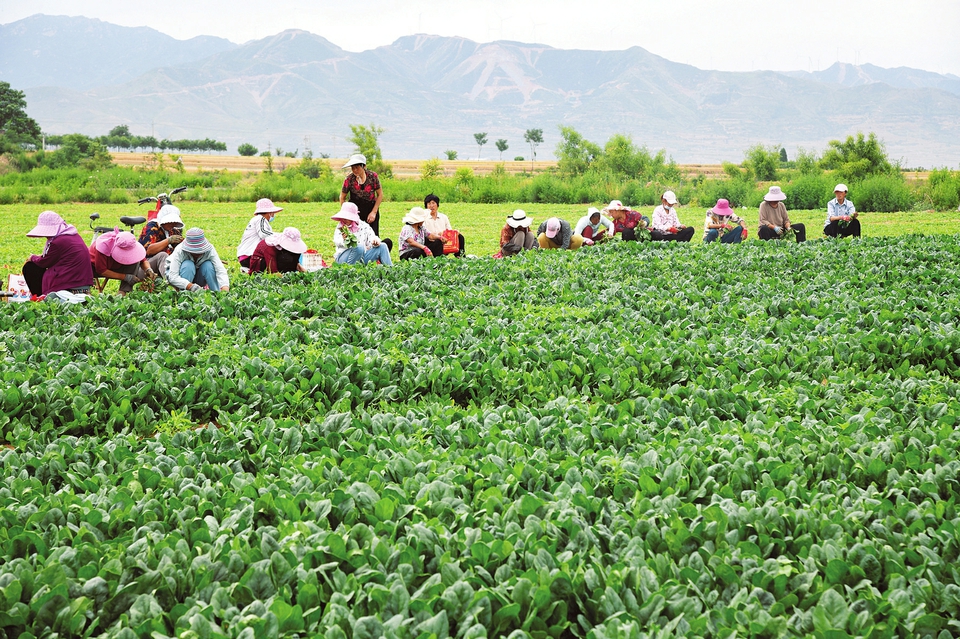 6月1日,聞喜縣后宮鄉(xiāng)新陽(yáng)莊村村民正在收割大田菠菜,準(zhǔn)備發(fā)往市場(chǎng)。